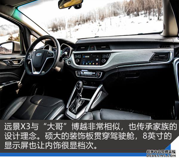 进到车内,远景X3与“大哥”博越非常相似,也传承家族的设计理念。硕大的装饰板贯穿驾驶舱,作为一辆不到7万元的小型SUV来说,远景X3的内饰很显档次。就拿此次试驾的车型来说,6.59万元的1.5L 自动尊贵型,耐玩页游,次顶配车型,有倒车影像、行车记录仪等配置,座椅也都是皮质的。如果增加2000元,增配到顶配车型,更有身稳定系统、刹车辅助以及上坡辅助和陡坡缓降等驾驶辅助功能。这些对付日常,甚至偶尔来趟近郊游,我想是绰绰有余了。