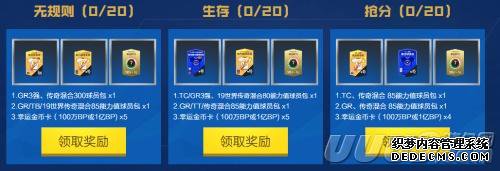 活动期间无规则/生存/抢分胜场分别累积到20场,可领取对应奖励,所有奖励可以领取1次。