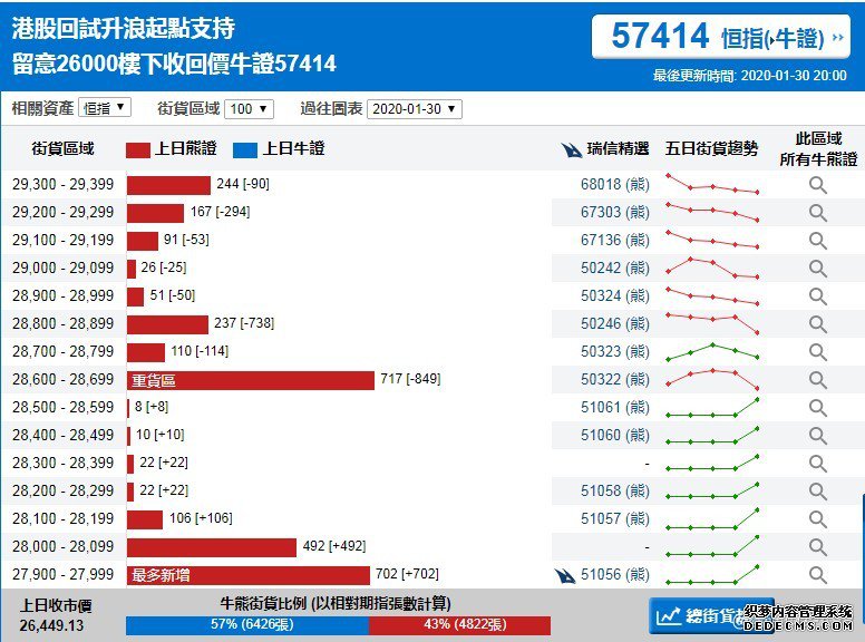 智通财经APP获悉,截至1月30日,恒指最新的牛熊街货比例57:43。瑞信恒指牛熊证街货分布图中的数据显示,熊证街货重货区在28600-28699区间,,该区间最新熊证数量为717张,较上一交易日减少849张,最多新增在27900-27999区间,新增702张。牛证街货重货区在25000-25099区间,该区间最新牛证数量为858张,较上一交易日增加68张,最多新增在26200-26299区间,新增185张。