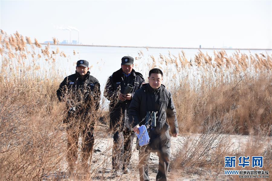 在天津北大港湿地自然保护区,野生鸟类保护员姚庆峰(右一)和同事一起对鸟类进行巡护(12月2日摄)。新华社记者 张宇琪 摄