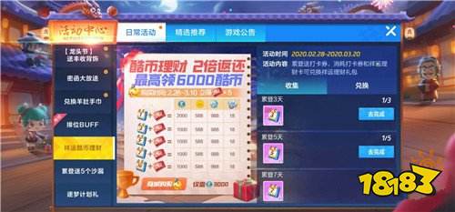 2.打卡三天+祥运理财卡*1=2号祥运理财礼包(开启后获得酷币*1000+金币*588+服饰币*988+奶瓶*18)。