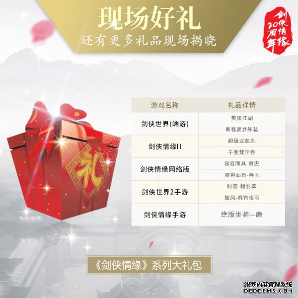 从1997年至2017年二十载春秋,剑侠情缘系列历经单机、网游、手游三大时代, 不断推陈出新,诞生了十余款游戏。庆典现场金牌制作人回顾剑侠系列游戏制作历程,众多剑侠大神将揭秘游戏幕后经历,追忆江湖路,分享他们的剑侠情缘故事,还有惊喜内容现场首曝。