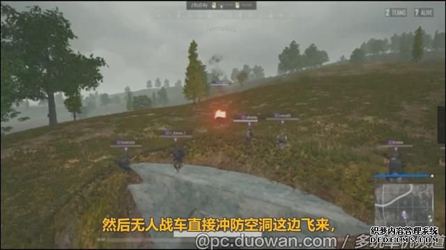 然后无人战车直接冲防空洞这边飞来,,这边一队看到飞来一辆车一脸懵逼,以为遇到bug,还想集火打爆,但无人车被打的冒着火依然横冲直撞。轮胎都打没了,外挂仍可以控制它飞啊,直接冲进防空洞撞人。