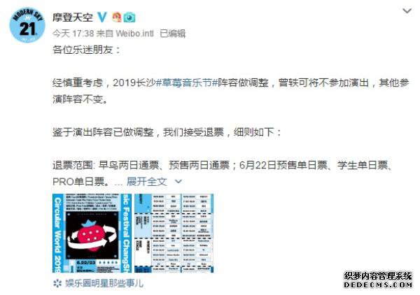 (原题为《曾轶可将退出长沙草莓音乐节演出,摩登天空接受退票》)
