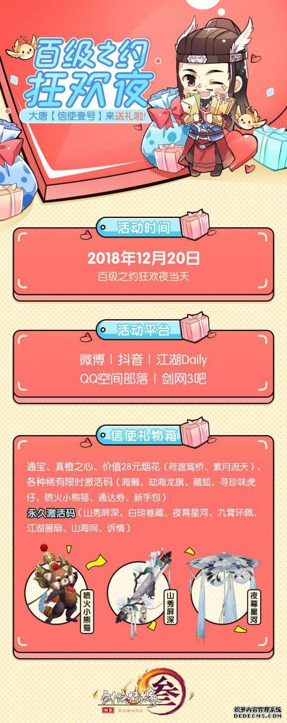 12月20日直播当天,大唐“信使壹号”送好礼!在微博、江湖daily、抖音、贴吧(网页私服游戏吧)、QQ空间部落(网页私服游戏标签)等平台分享狂欢夜当天相关内容,都将有机会获得惊喜礼品,在各个平台同步发布可增加中奖几率!