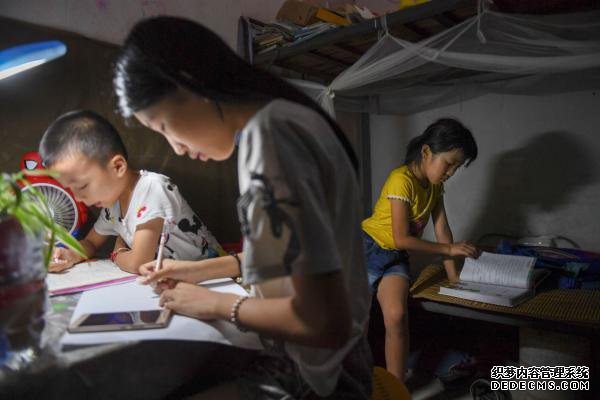 在福建石狮的一家服装厂宿舍,卢嫦莉(右)、卢彭瀚(左)姐弟和他们的表姐刘磊看书学习。