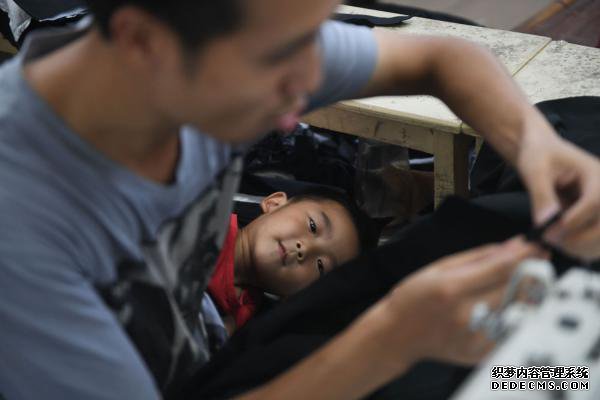 在福建省石狮市一家服装厂的车间,从老家赶来与父母相聚的聪聪注视着一旁忙碌的爸爸。