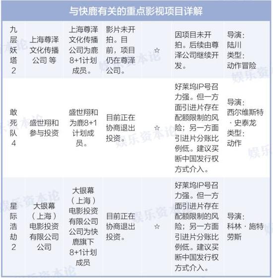 其中一家公司的负责人告诉娱乐资本论,上述20几个项目大部分原来就隶属于8家制作公司,快鹿集团是看中他们各自手中的电影项目,才在公司层面建立了合作,并将这些项目都纳入麾下。