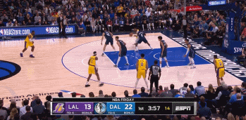 东契奇持球,独行侠打高位双掩护,这个战术他们在这场比赛里打成了多次,理想状态下,这个回合最终会由东契奇支配传球,波尔津吉斯下顺空接扣篮终结。但詹姆斯的弱侧补位,成功地化解了独行侠的这次进攻——他先是通过阅读比赛,预判到了独行侠的战术意图,补位轮转到了禁区,使得东契奇无法直接与波尔津吉斯形成连线,只得退而求其次地将球传给了底角的队友,随后,詹姆斯又立刻回归到了自己的防守位置上,阻碍了对手在第一时间完成三分投篮。