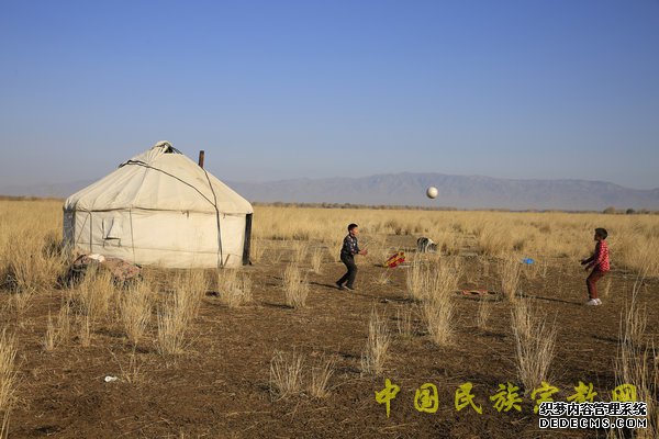 在额尔齐斯河牧场踢足球的哈萨克族孩子