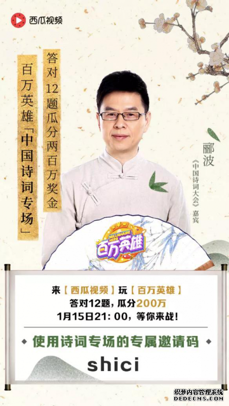 近日,一款名为《百万英雄》的实时直播类答题节目风靡网络。这项由西瓜视频推出的活动,题目涵盖的知识面非常广,囊括了天文地理、人文历史、体育科技、明星八卦,可以说非常考验网友的知识库容量。在1月15日,《百万英雄》还推出了“中国诗词专场”专场,为弘扬中国传统文化贡献力量。