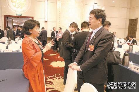 全国人大代表李亚萍(左)和全国人大代表刘宛康交流议案建议。记者张哲摄