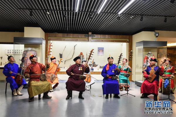 7月15日,在赤峰博物馆,《格萨(斯)尔》国家级非遗传承人金巴扎木苏(前排右二)和团队一起表演节目。新华社记者 刘磊 摄